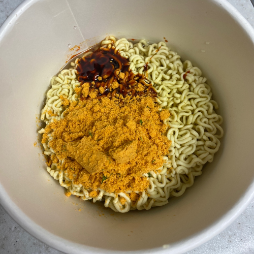 액상스프와 분말스프를 넣고 오른쪽 사진과 같이 면을 뒤집음