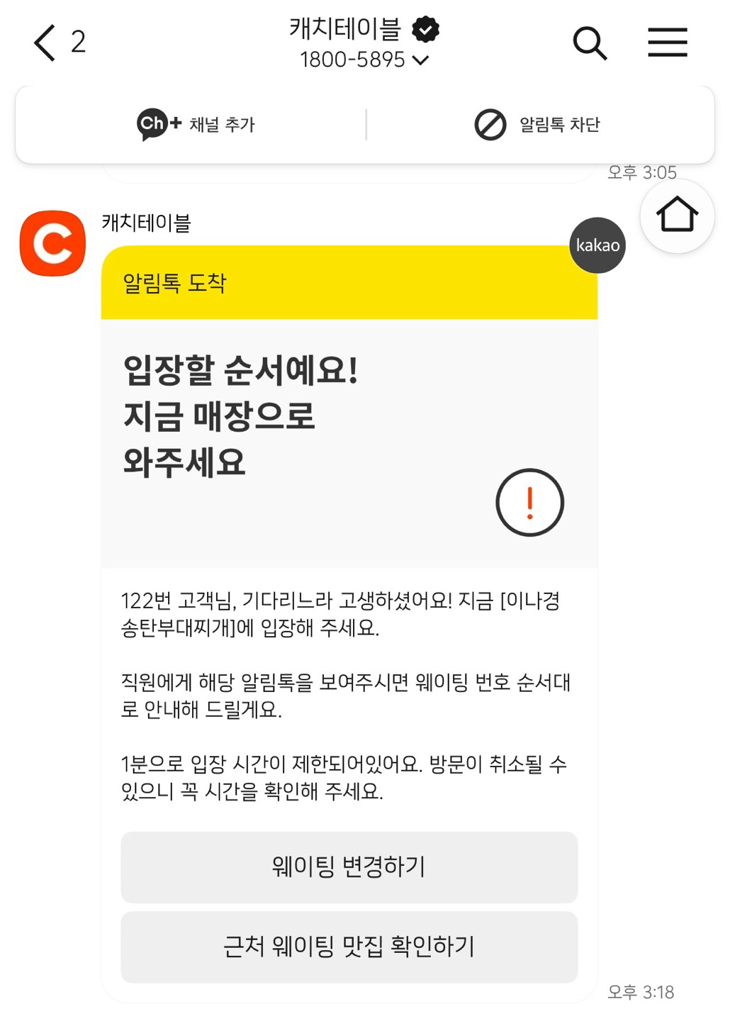 3시 18분 입장 알림