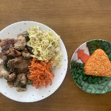 구운 파닭 + 구운 마늘 + 양배추& 당근라페 (+) 점심엔 김치치즈 주먹밥 추가)